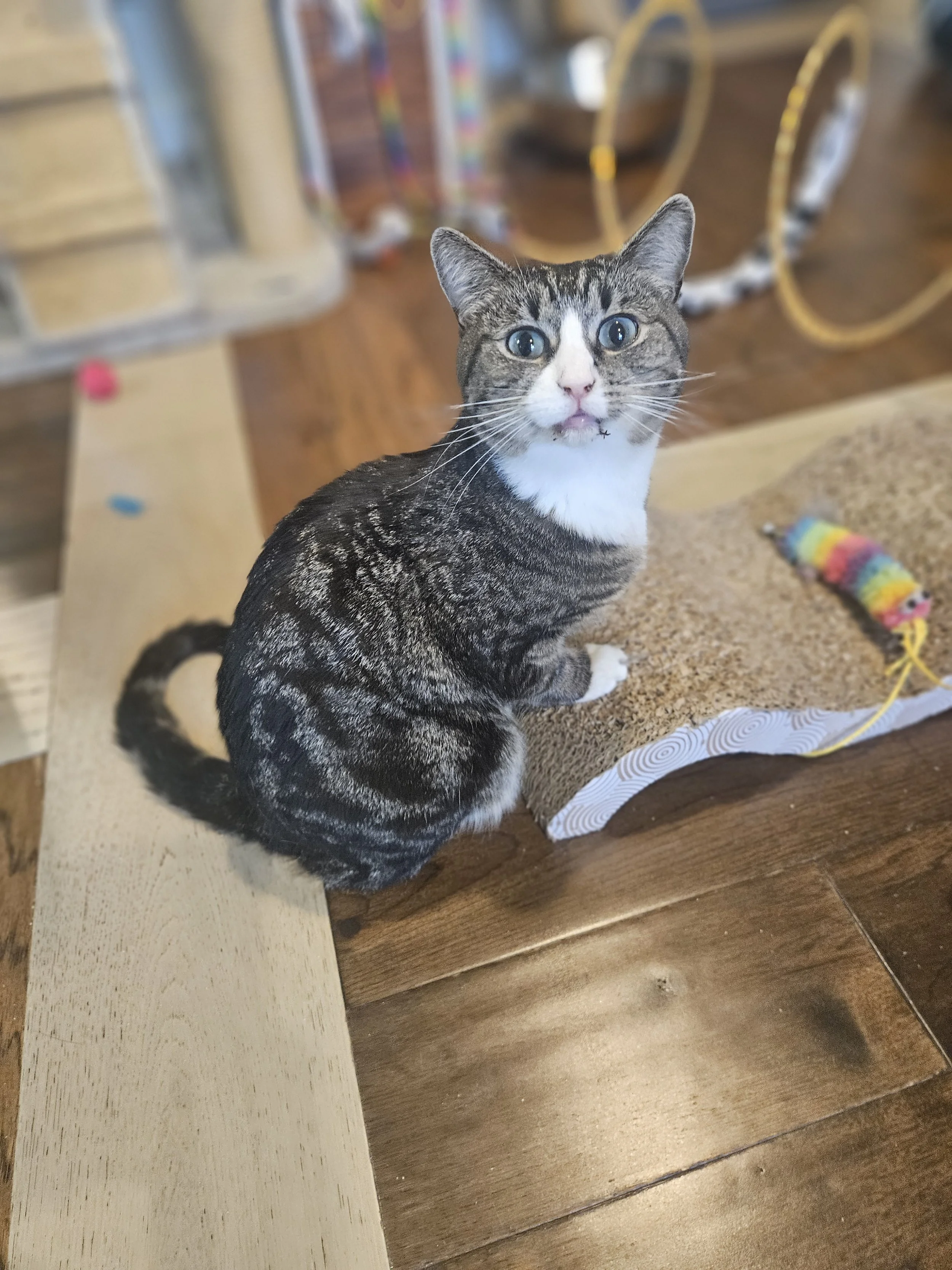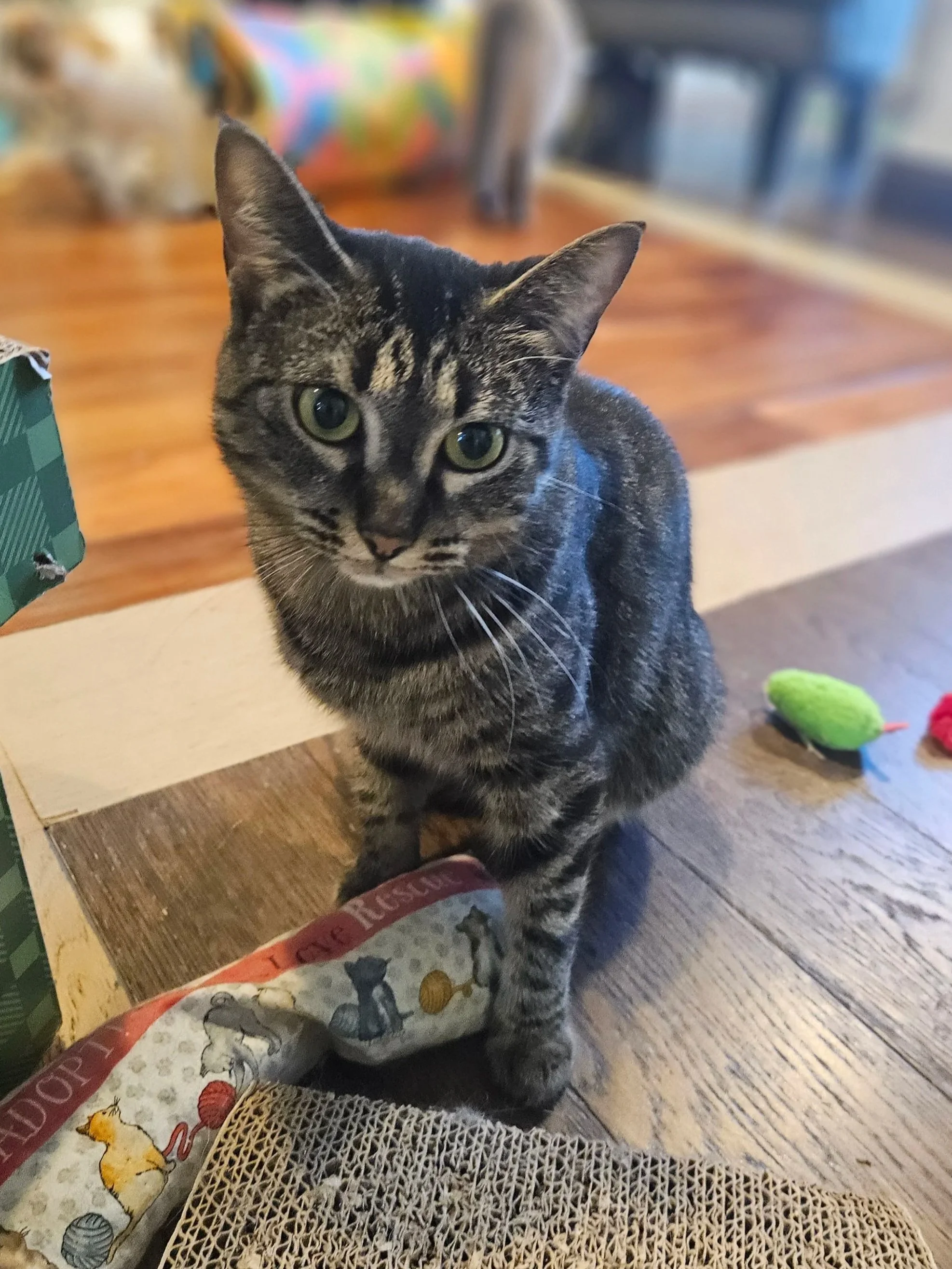 I'm as pretty as I sound. No, I will not immediately fall into your arms. I like to keep a bit of mystery. I'm shy at first, but don't mistake that for anything other than excellent judgement. The cat lounge is a full-on circus, and while I tolerate my roommates, I'm more of a "quiet lounge, soft blanket, personal human" kind of girl. I'll give some spice if my boundaries are crossed. My sweet side is starting to break through as I've been coming out my shell. I like affection, I like calm, and I love knowing my space is safe. I've been spotted playing with wand toys, but then I remember I'm on security duty and retreat to my shelf to super- vise. I'm a girl who knows what she likes - and what I like is peace, comfort and a human to call my own. I'm waiting to blossom with you?