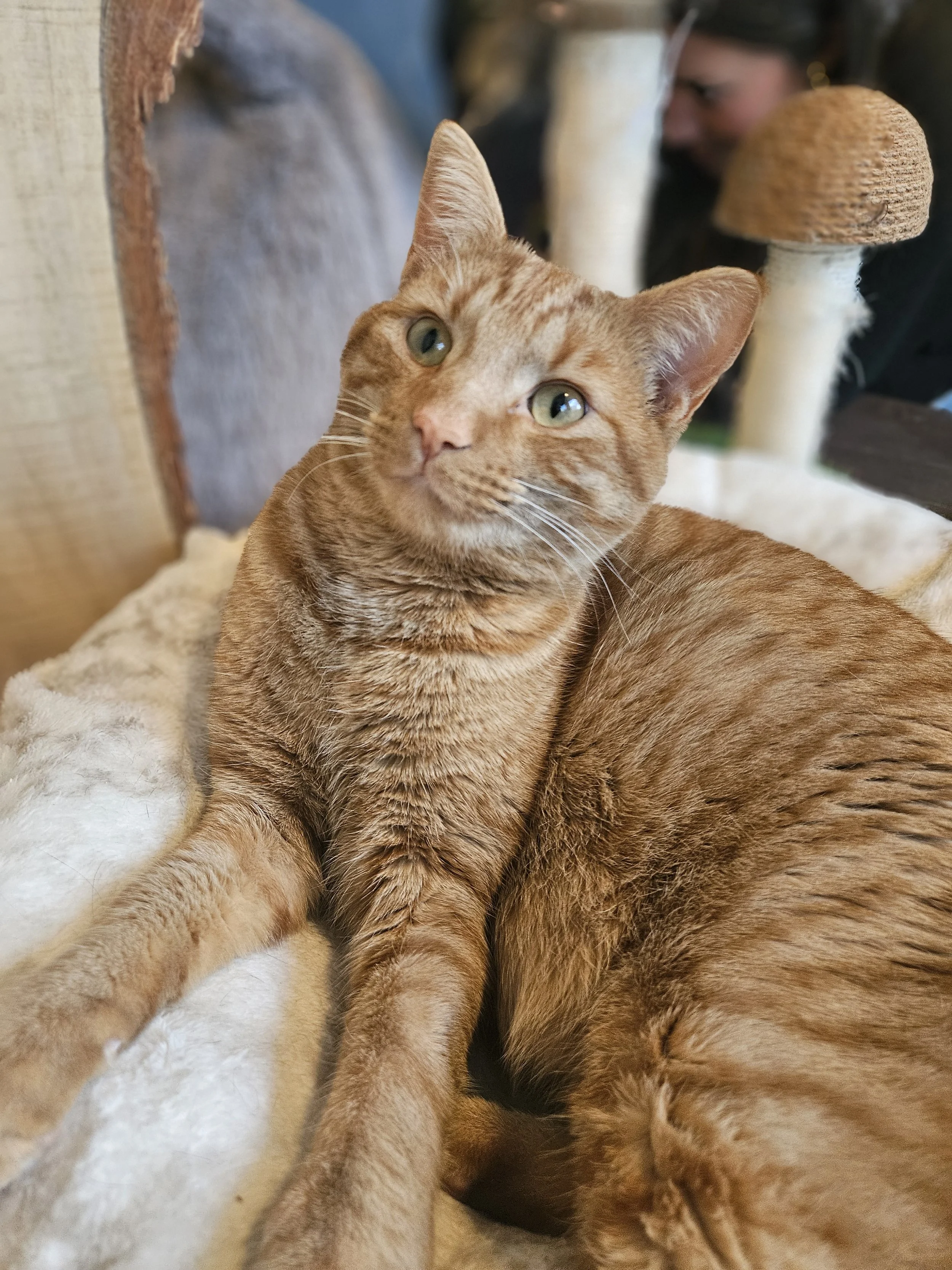 Looking for the ultimate mellow guy? Here I am - a gentle giant with a big heart, big purrs and a super chill vibe. Nothing really ruffles my fur; I take life one slow blink at a time. Whether the world's buzzing around me or totally still, I'm just here to enjoy the moment (and maybe a cozy nap or two). I've got that classic ginger airhead charm - sweet, a little goofy and always easygoing. I get along with everyone, cats and humans alike, but I'm happiest in calm spaces where I can lounge, loaf and soak up good vibes. If you're looking for a laid-back companion to keep you company through lazy afternoons and quiet evenings, I'm your guy. Let's chill together - I promise, life's just better with a little mango in it.