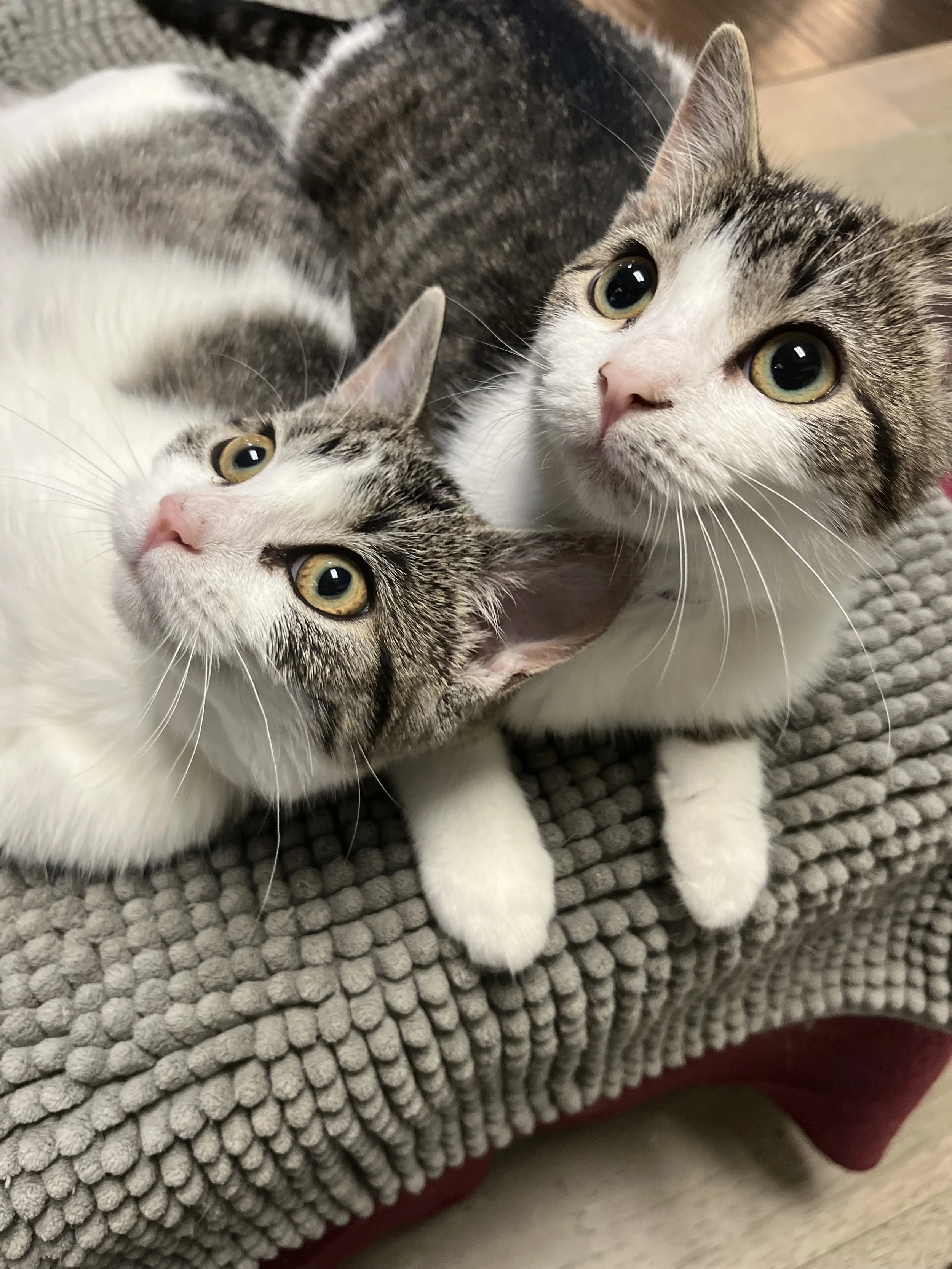 Nearly identical, royal level cuties with matching fur, matching faces and matching purr-sonalities. You could say we're joined at the hip - if one of us is playing, you can bet the other isn't far behind, either joining in or cheering from the sidelines. We spend our days perfecting the fine arts of playtime, purring and melting hearts. Our hobbies include synchronized zoomies, snuggle marathons and looking absolutely precious while doing literally anything. We're still young, so who knows what kind of cats we'll' grow into - but one thing's for sure: you'll have front-row seats to watch our personalities blossom, and it'll make your heart feel about three sizes bigger. Two royal sisters, one