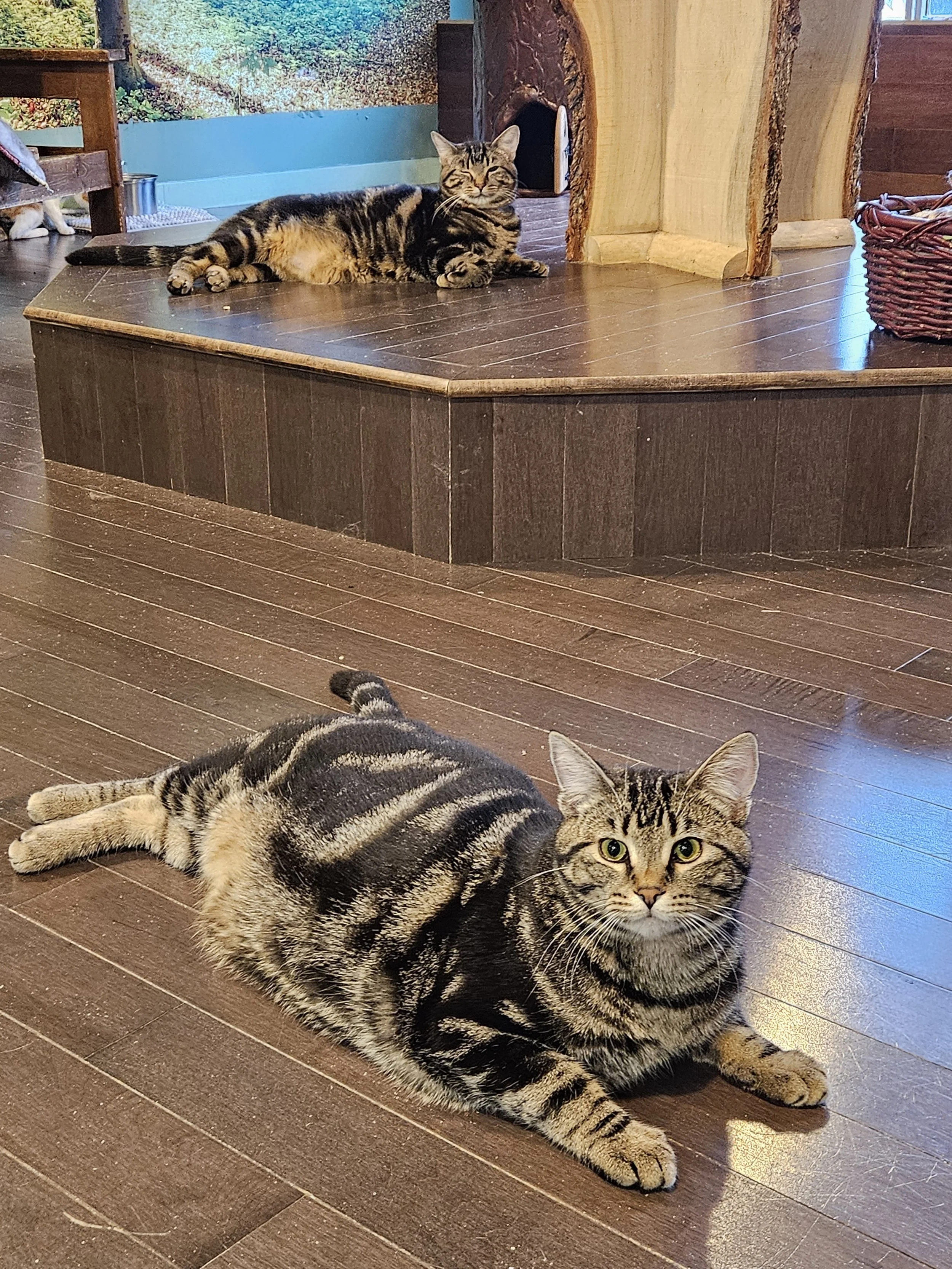 We are the brotherly bandits: professional brothers and part-time chaos coordinators. Our origin story? Started out on the streets, captured at the tiny age of two months. After some time in foster care, we discovered the finer things in life: shoulder rides, couch lounging and humans who can provide snacks on demand. Moving to the café was a little overwhelming for us, but we're learning to trust again - and every day we get a little braver. Clyde is the outgoing one. He will bop your leg for petting time. No meeting required. Clancy is more of a "I'll need to run a background check first" kind of guy. But once you pass inspection? You're in. If your home could use double the mischief and double the love, we're ready for our next adventure.