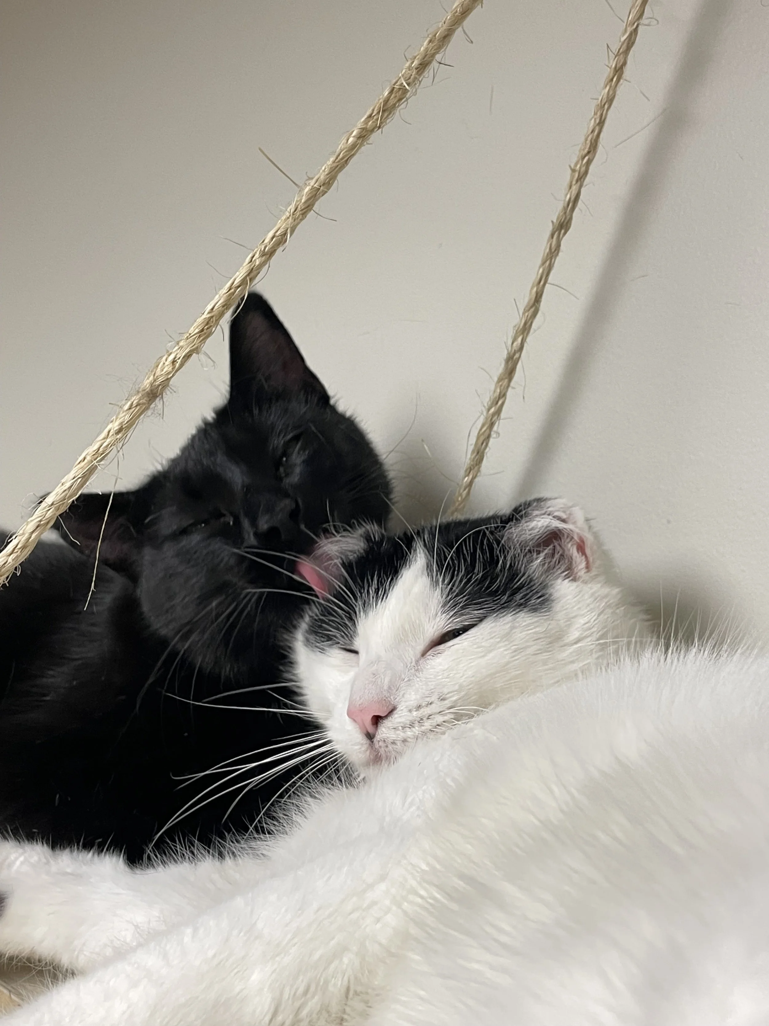 Memphis here - resident gentle giant and proud single dd (by adoption not biology). When I first meet you, I might hang back and size things up - you know, make sure you're worthy of my deluxe purr package. But once I decide you're my person, prepare yourself for endless cuddles, gentle headbutts and me serenading you. I'm a calm soul with a big heart, and I absolutely adore other kitties - especially my boy, Bogart. Bogart reporting for duty! I'm the outgoing, confident one of this duo. I love playtime, cozy naps and curling up either on you or right beside you (I like to keep my humans close). I also…uh…like to nurse on Memphis sometimes. Don't judge - It's a comfort thing! He doesn't mind as he's basically my emotional support parent. Together we're a package deal of love and balance.