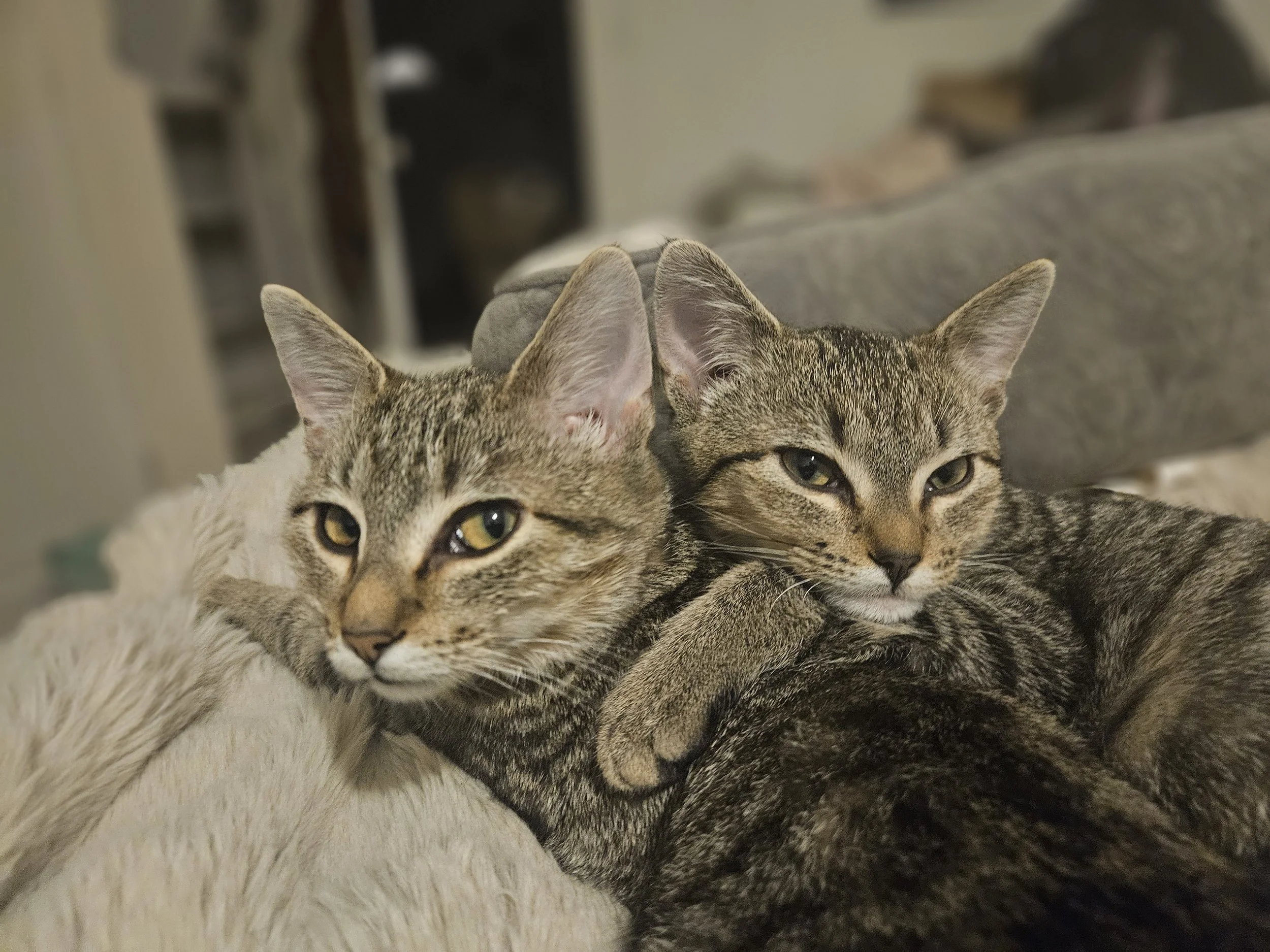 Yeah - we are super cute. You may admire us. We'll wait. We're a package deal - a bonded sister duo, two halves of one very fabulous whole. Bathroom trip? Together. Nap? Together. Judging you softly from across the room? Absolutely together. We're cuddly, but in a refined kind of way. We enjoy cuddling, preferably in a sunbeam, looking impossibly cute while doing so. We also enjoy playtime, very much - chasing toys, having little zoomie moments and then immediately return to lounge mode - balance is important. We have big personalities; we just don't shout about it. We're not dramatic, not demanding- just perfectly matched pair of sweet, playful, low-key companions who will absolutely steal your heart.